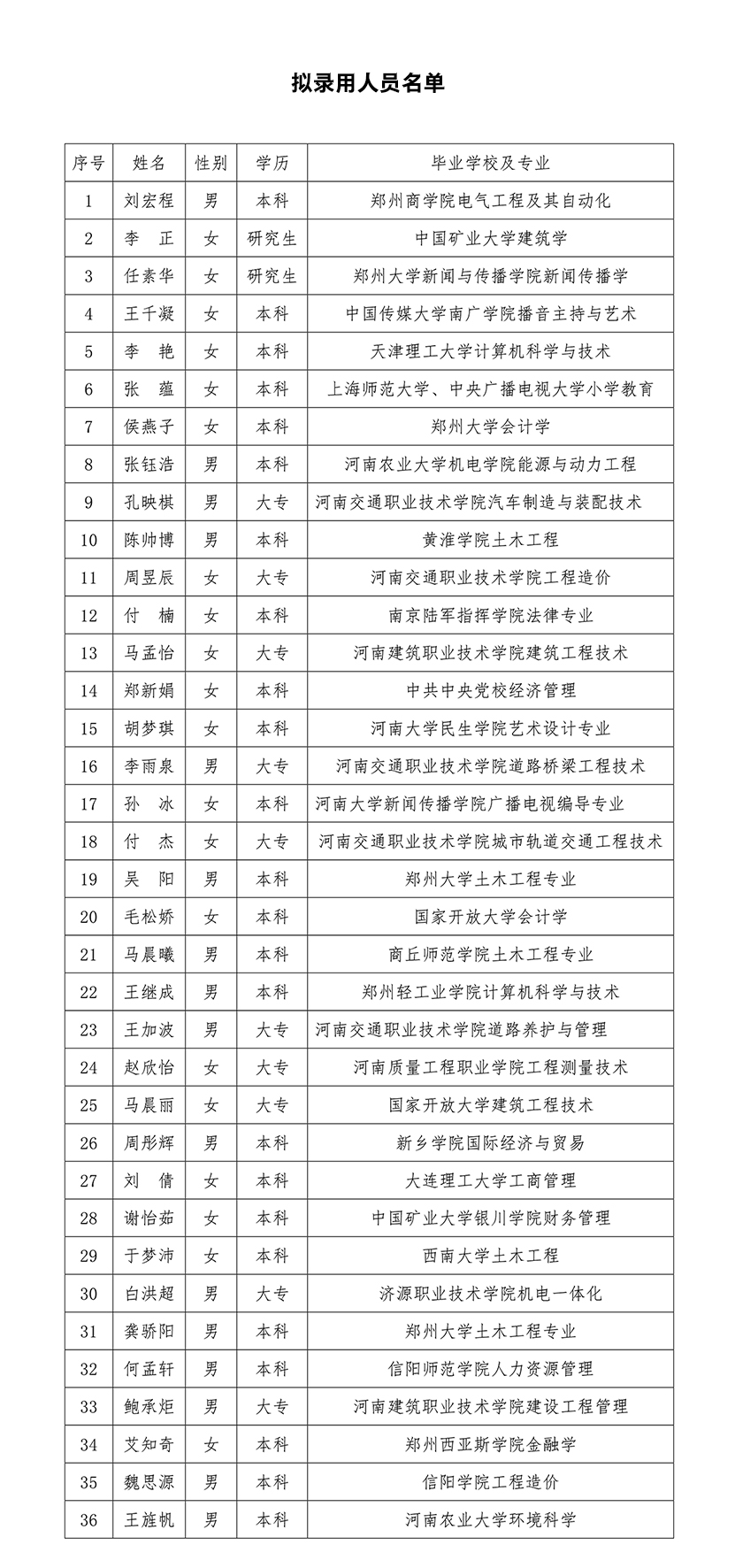 根據(jù)2023年度招聘計(jì)劃,經(jīng)筆試、面試及綜合素質(zhì)評價(jià),經(jīng)公司黨委會研究決定,擬錄用以下36名人員為我公司職工,試用期為3個(gè)月,試用期滿進(jìn)行考核,考核結(jié)果為合格及以上將予以正式錄用,考核不合格的將解除勞動(dòng)合同。